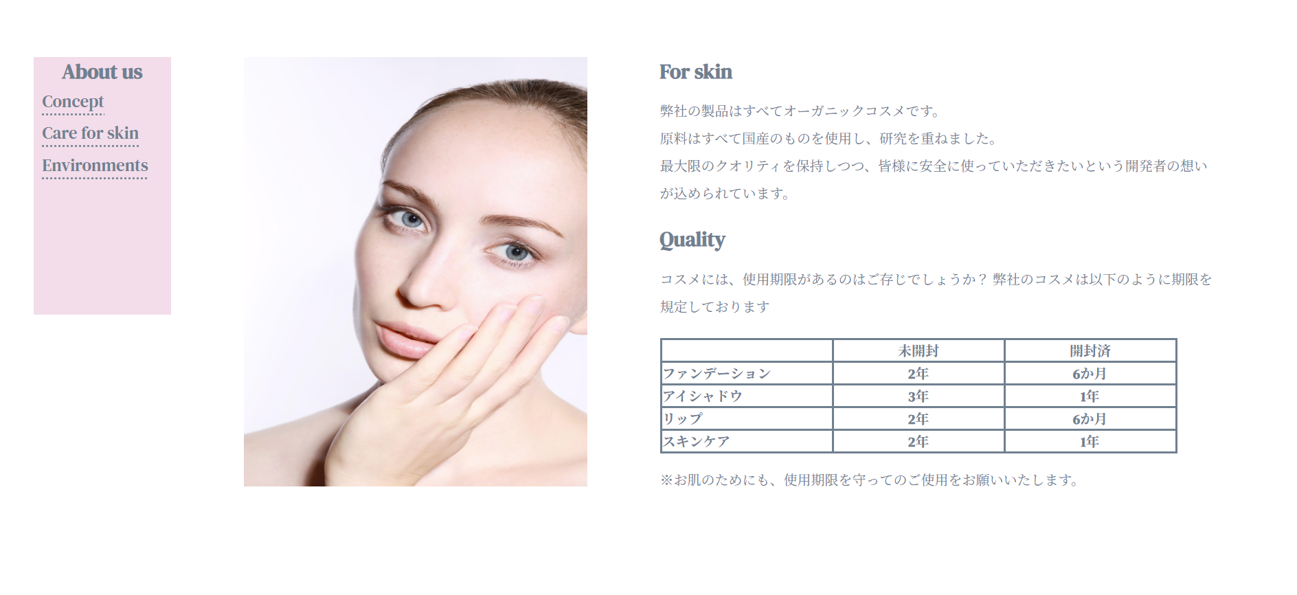 | サイトのこだわり | オーガニックコスメのブランド。 メインターゲットは、20代〜30代ですが、他の年代、 男性にも「美しさ」を届けるといった想いを持つ企業。 サイト全体の雰囲気は「落ち着いた」「大人っぽい」を、 キーワードに配色や配置を決定。 |